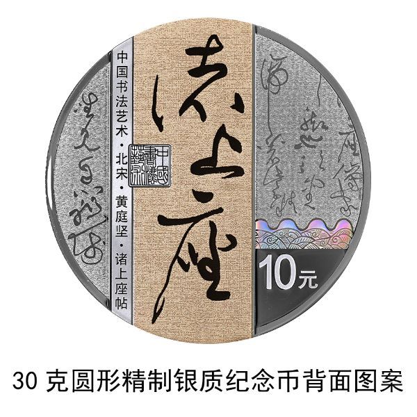 30克圆形银质纪念币背面图案为北宋黄庭坚书《诸上座帖》局部文字及“诸上座”字样与笔架、“中国书法艺术”篆刻钤印等组合设计,并刊“中国书法艺术·北宋·黄庭坚·诸上座帖”字样及面额。
