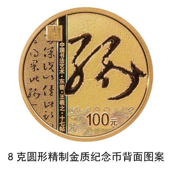 8克圆形金质纪念币背面图案为东晋王羲之书《十七帖》局部文字及“缘”字样与装饰纹样、“中国书法艺术”篆刻钤印等组合设计,并刊“中国书法艺术·东晋·王羲之·十七帖”字样及面额。