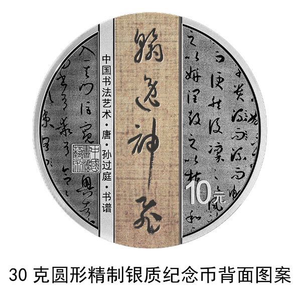 30克圆形银质纪念币背面图案为唐代张旭书《古诗四帖》局部文字及“贤哲”字样与“中国书法艺术”篆刻钤印等组合设计,并刊“中国书法艺术·唐·张旭·古诗四帖”字样及面额。