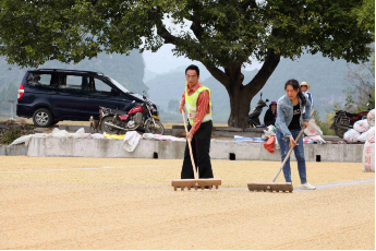 图1:蔡文和小棠在晒坪上帮村民翻晒稻谷。