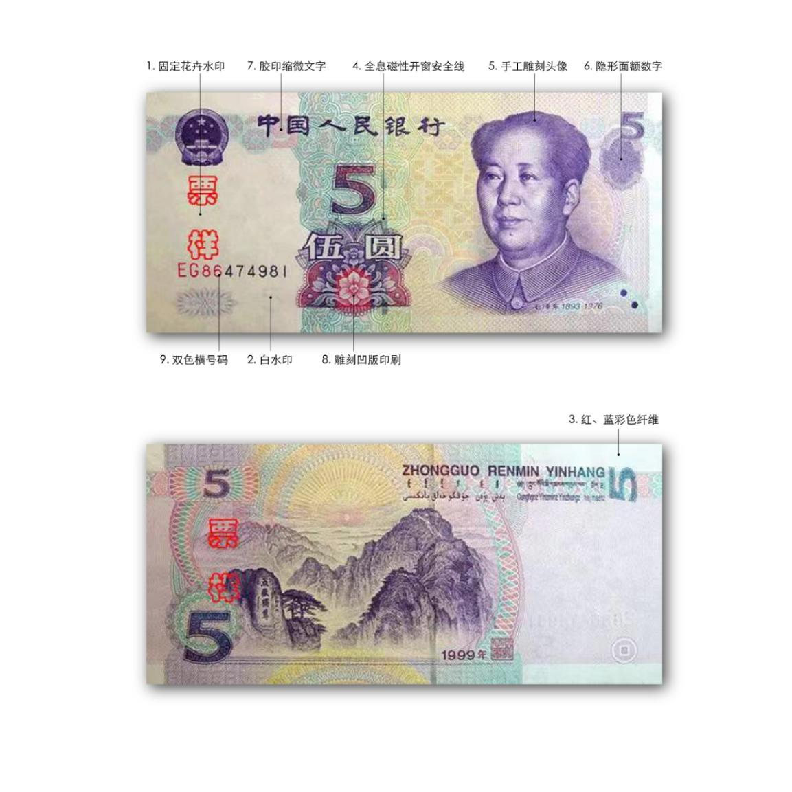 主色调为紫色,票幅长135毫米,宽63毫米。正面主景为毛泽东头像,左侧为“中国人民银行”行名、阿拉伯数字“5”、面额“伍圆”和花卉图案,左上角为中华人民共和国国徽图案,左下角印有双色横号码,右下角为盲文面额标记。背面主景为“泰山”图案,右上方为“中国人民银行”汉语拼音字母和蒙、藏、维、壮四种民族文字的“中国人民银行”字样和面额。