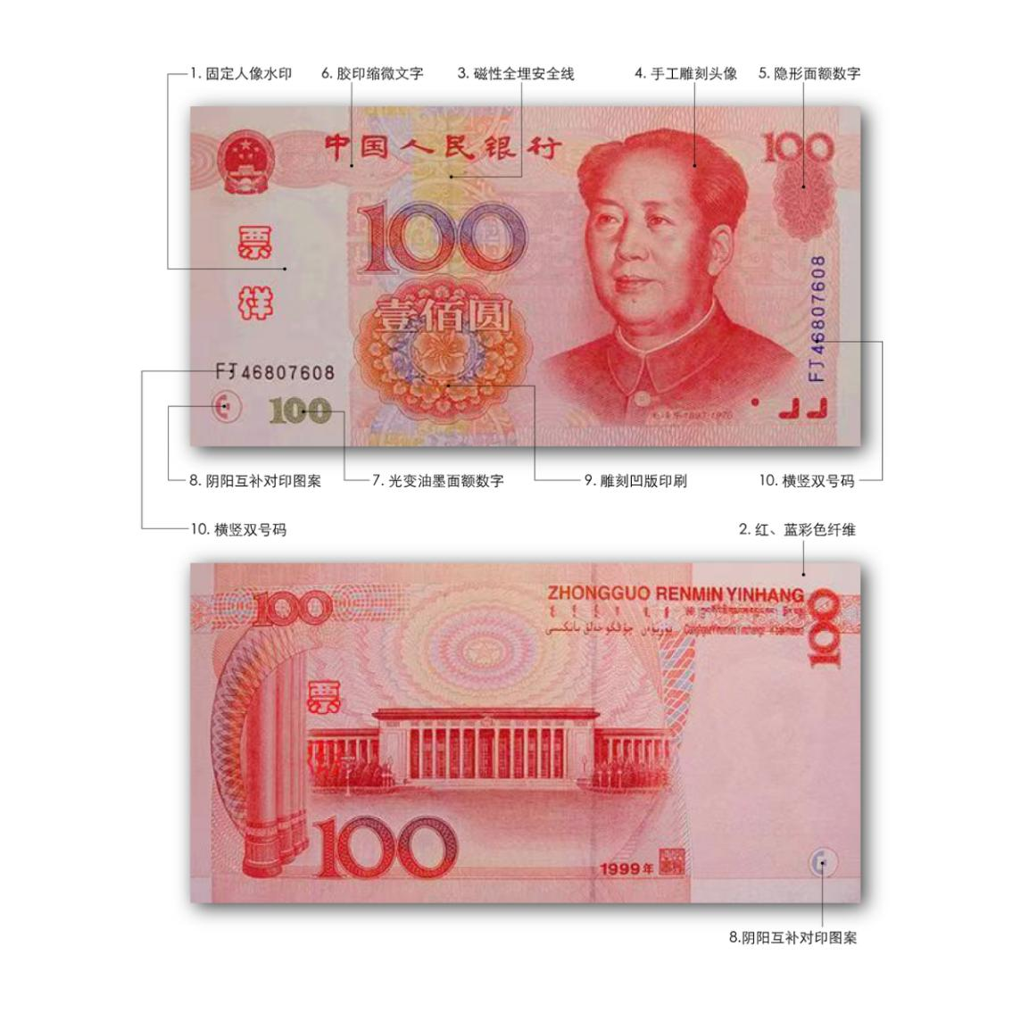 主色调为红色,票幅长155mm、宽77mm。正面主景为毛泽东头像,左侧为“中国人民银行”行名、阿拉伯数字“100”、面额“壹佰圆”和花卉图案,左上角为中华人民共和国国徽图案,右下角为盲文面额标记,票面正面印有横竖双号码。背面主景为“人民大会堂”图案,左侧为人民大会堂内圆柱图案,右上方为“中国人民银行”的汉语拼音字母和蒙、藏、维、壮四种民族文字的“中国人民银行”字样和面额。
