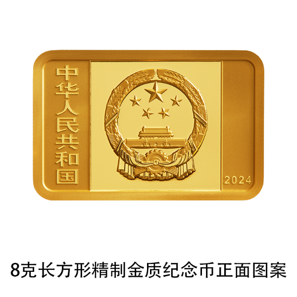 8克长方形金质纪念币为精制币,含纯金8克,规格23毫米×15毫米,面额100元,成色99.9%,最大发行量10000枚。