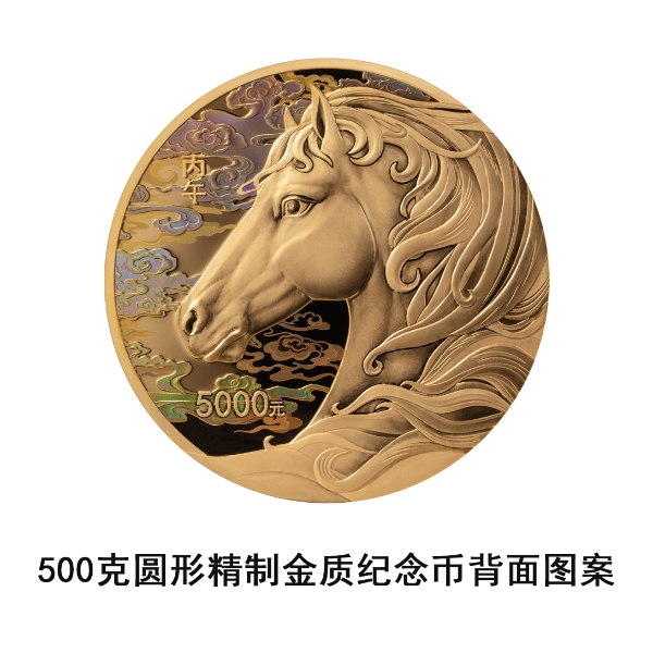 500克圆形金质纪念币背面图案为装饰马头造型,衬以祥云组合设计,并刊“丙午”字样及面额。