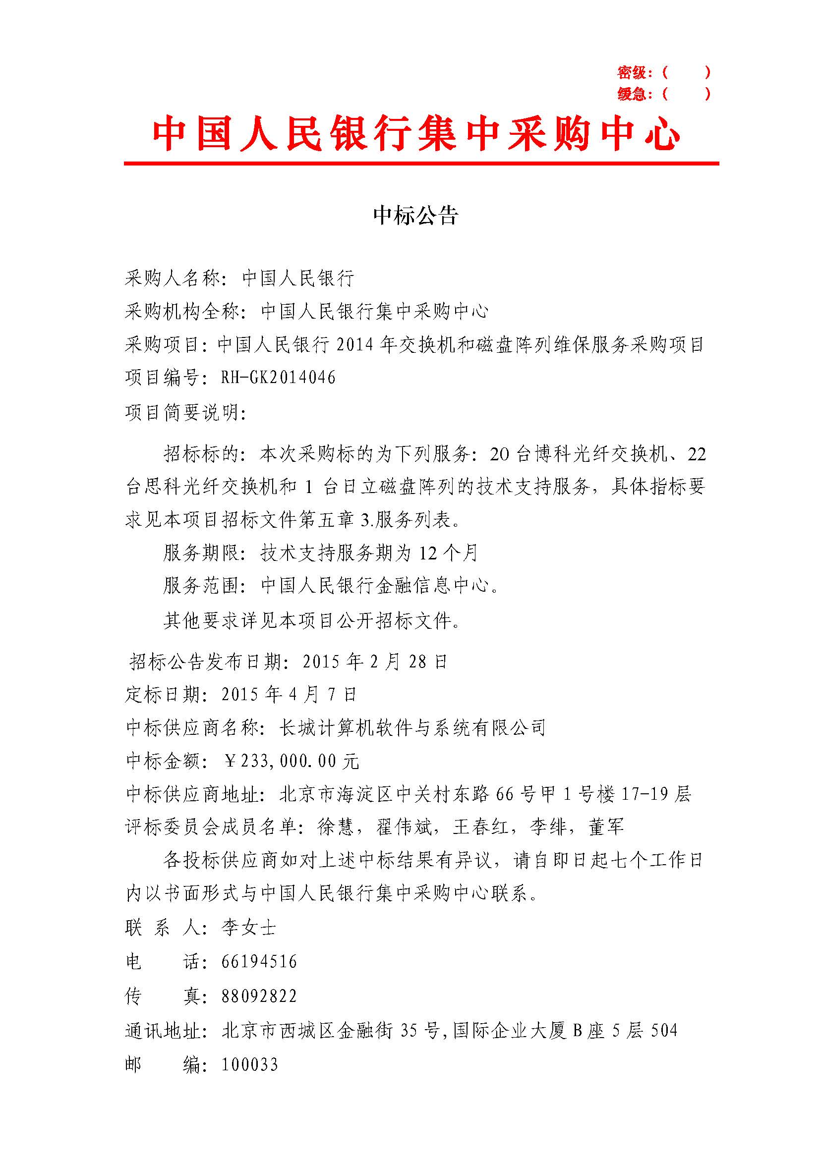 中国人民银行2014年交换机和磁盘阵列维保服务采购项目 RH-GK2014046 中标公告