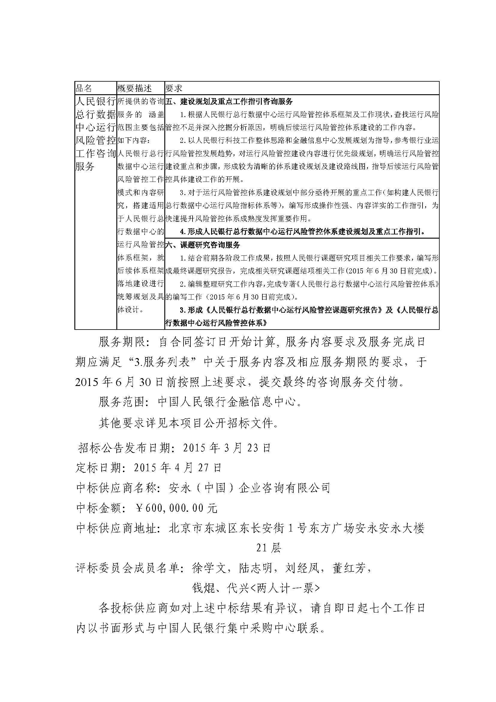 中国人民银行总行数据中心运行风险管控工作咨询服务采购项目 RH-Gk2015003 中标公告