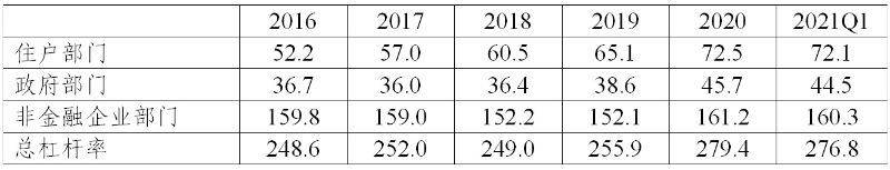 2020年,货币政策灵活适度,适时调整,加大对实体经济支持,有力抵御了新冠肺炎疫情的冲击。虽然,2020年我国宏观杠杆率上升23.5个百分点,但是我国经济增长韧性更强,实体经济很快得到恢复,这又为继续推动稳杠杆提供了坚实的经济基础。2020年二季度起,我国宏观杠杆率上升幅度逐季收窄,2020年前三季度杠杆率增幅分别为14、7.2、3.9个百分点,2020年四季度和2021年一季度杠杆率分别下降1.6、2.6个百分点,降幅不断扩大表明我国各项政策协调配合得当,在稳住经济的同时,也保持了宏观杠杆率的基本稳定,并取得进一步成效。