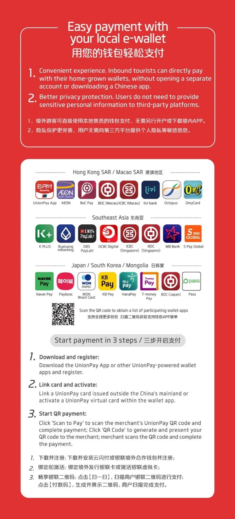 如您为银联境外合作钱包用户,可直接使用本地熟悉的钱包在银联标准二维码商户进行扫码支付,无需另行下载境内APP。目前韩国、日本、泰国等17个亚洲国家与地区的85个APP已开通银联支付。