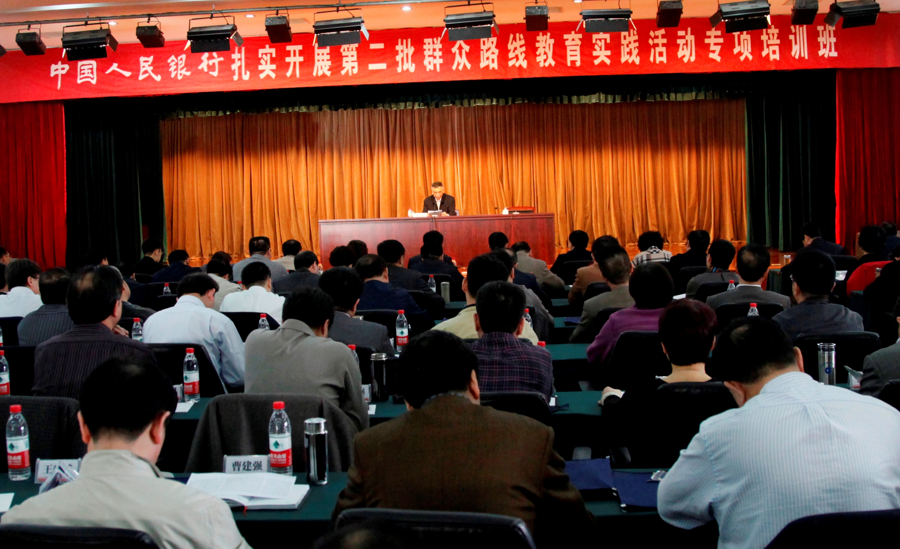 2014年3月17至19日,人民银行在郑州举办扎实开展第二批群众路线教育实践活动专项培训班,认真贯彻落实中央关于首先抓好第一责任人的教育培训的精神要求,对人民银行系统全体地(市)中心支行党委书记进行扎实开展第二批教育实践活动专项培训。人民银行党委委员、副行长、教育实践活动领导小组副组长李东荣同志到培训班作了专题辅导。